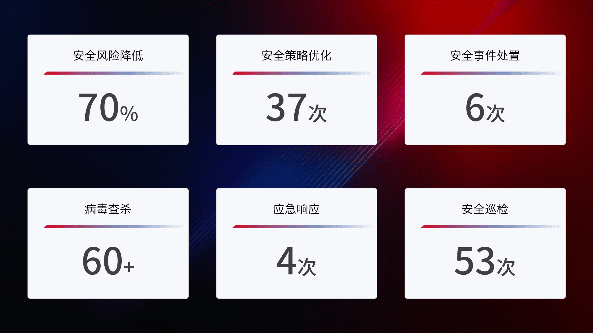 提供全面的安全事件报告体系,,,,包括处置报告、、、周报、、、、季度和年度总结,,,,结合持续监控,,帮助客户深入了解网络安全状况。。。